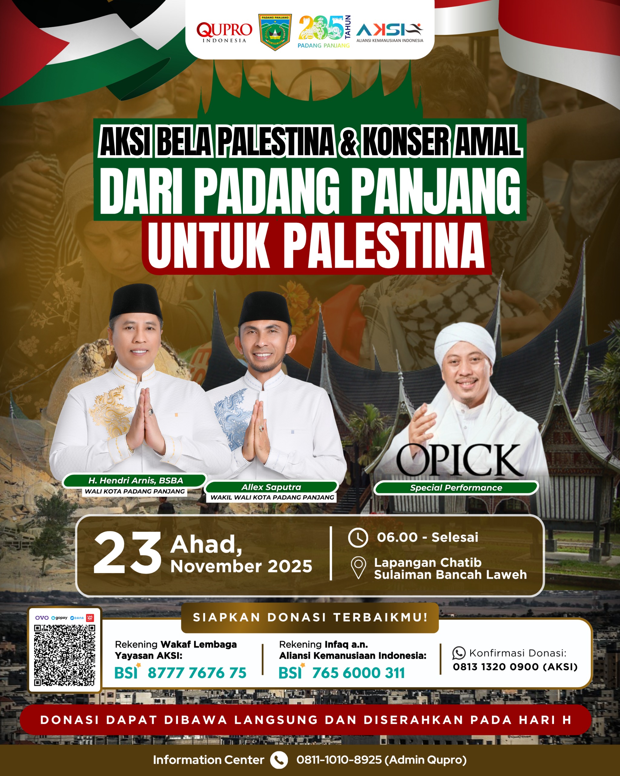 PADANG PANJANG, RELASIPUBLIK.com – Pemerintah Kota Padang Panjang mengajak seluruh masyarakat untuk turut bergerak dalam Aksi Bela Palestina dan Konser Amal bersama Opick yang akan digelar Ahad (23/11/2025) di Lapangan Khatib Sulaiman, Bancah Laweh. Kegiatan ini menjadi momentum memperkuat kepedulian dan solidaritas warga terhadap krisis kemanusiaan yang dialami rakyat Palestina.