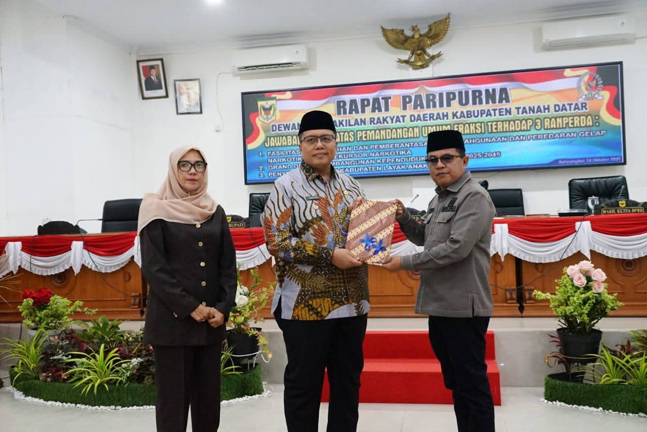 Dewan Perwakilan Rakyat Daerah (DPRD) Kabupaten Tanah Datar menggelar rapat Paripurna tentang Jawaban Bupati atas Pemandangan Umum Fraksi DPRD terhadap 3 (tiga) Rancangan Peraturan Daerah (Ranperda), Kamis (16/10/2025) di ruang sidang utama gedung DPRD setempat.