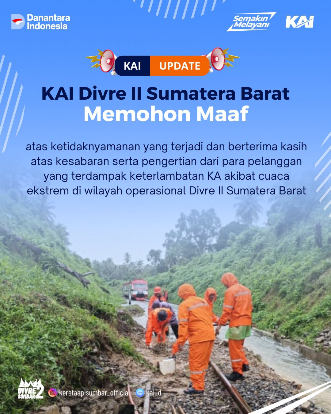 Padang,relasipublik – PT Kereta Api Indonesia (Persero) Divisi Regional II Sumatera Barat menyampaikan permohonan maaf kepada seluruh pelanggan atas ketidaknyamanan yang terjadi akibat kondisi cuaca ekstrem di wilayah operasional Divre II Sumatera Barat yang menyebabkan luapan air di beberapa titik wilayah operasional. Kondisi tersebut terpantau sejak Kamis, 27 November 2025 pagi, dan berdampak pada pengaturan beberapa perjalanan kereta api.
