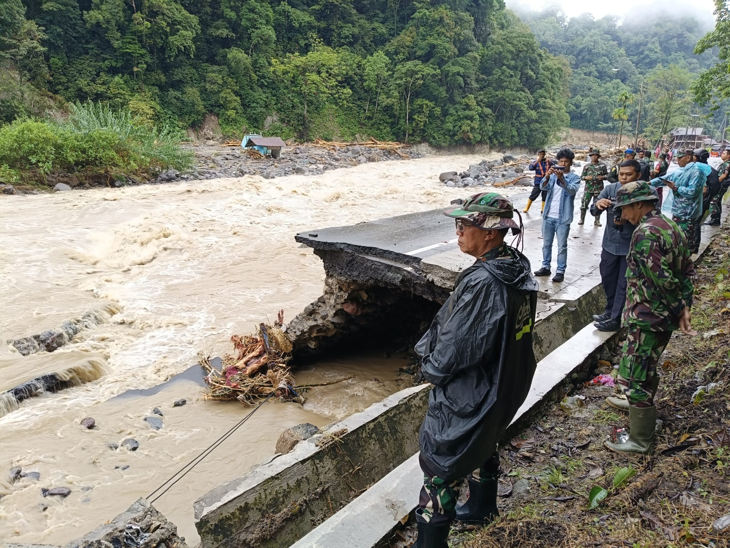 Setiba di lokasi, Danrem 032/Wbr bersama rombongan melihat langsung kondisi kerusakan yang cukup parah, di mana sebagian lebar jalan tenggelam oleh longsoran tanah dan material yang tergerus aliran air. Keadaan ini membuat arus lalu lintas kendaraan roda empat maupun roda dua tidak bisa dilalui.