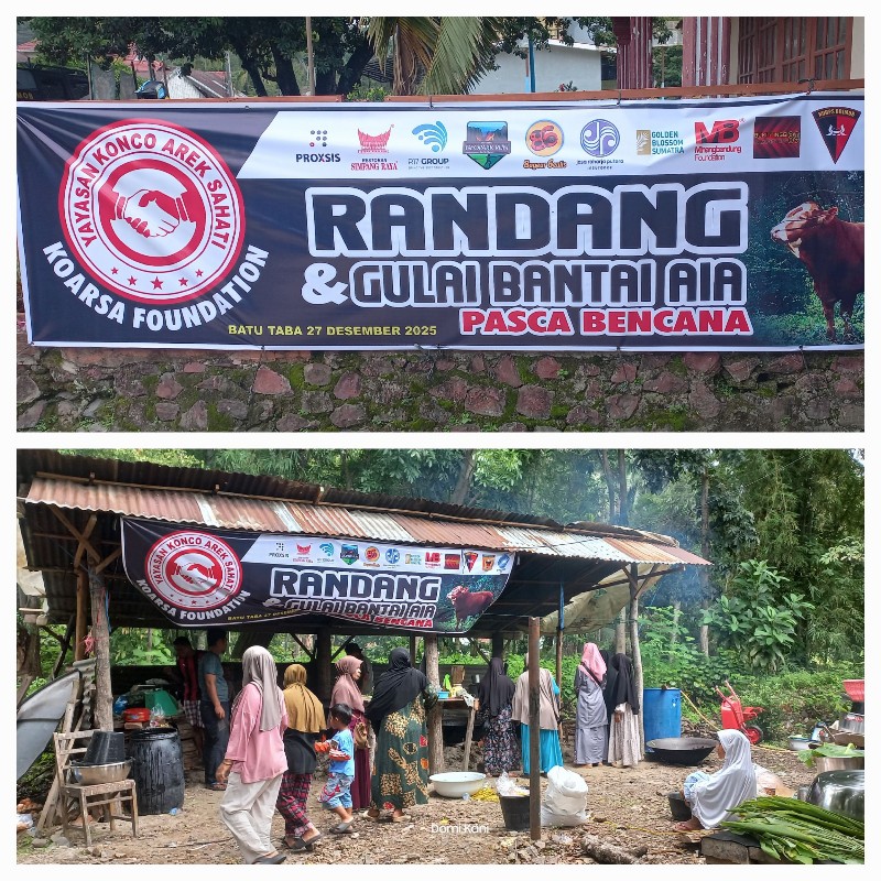 Asap dapur yang mengepul di Nagari Batu Taba, Kecamatan Batipuah Selatan, Sabtu (27/12), bukan sekadar pertanda masakan sedang dimasak. Dari kuali-kuali besar itu, empati dan kepedulian tengah diracik. Yayasan Koarsa (Konco Arek Sahati) Foundation memilih memasak Randang dan Gulai Bantai Aia sebagai bahasa kemanusiaan untuk menyapa para korban banjir bandang dan tanah longsor di Sumatera Barat.