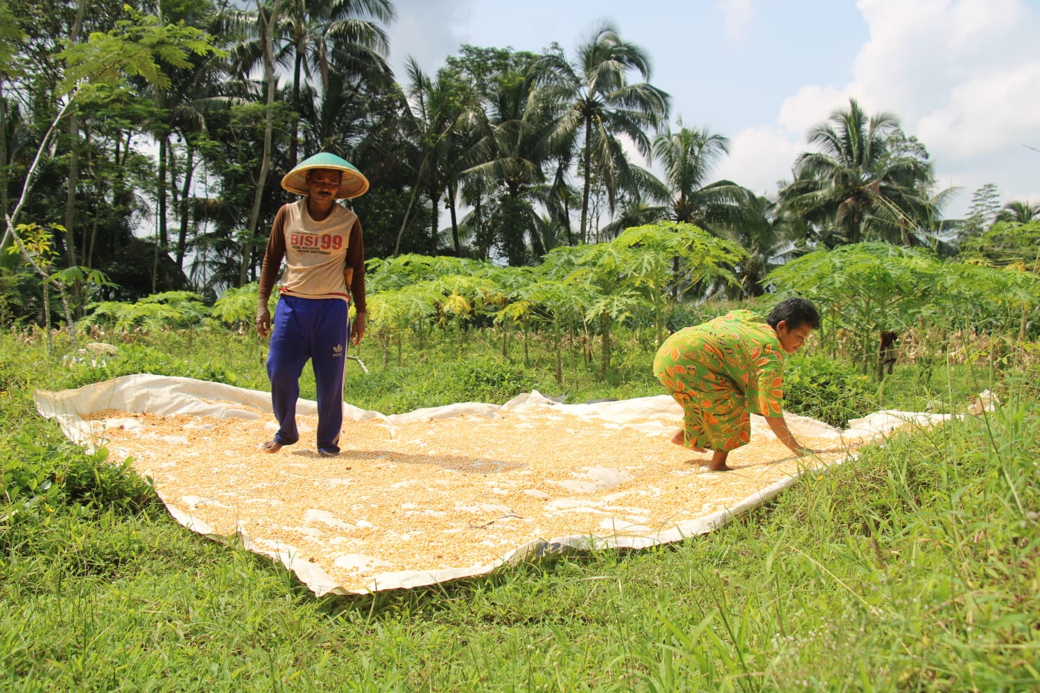 Purbalingga, relasipublik — Di bawah terik matahari siang, Sulaiman bersama sang istri masih sibuk menjemur jagung hasil panen di kebun Desa Krangean, Kecamatan Kertanegara, Kabupaten Purbalingga. Butiran jagung disebar merata di atas terpal, lalu sesekali dibalik agar cepat kering. Meski raut lelah tampak jelas, harapan justru terpancar dari wajah keduanya di balik aktivitas sederhana tersebut.