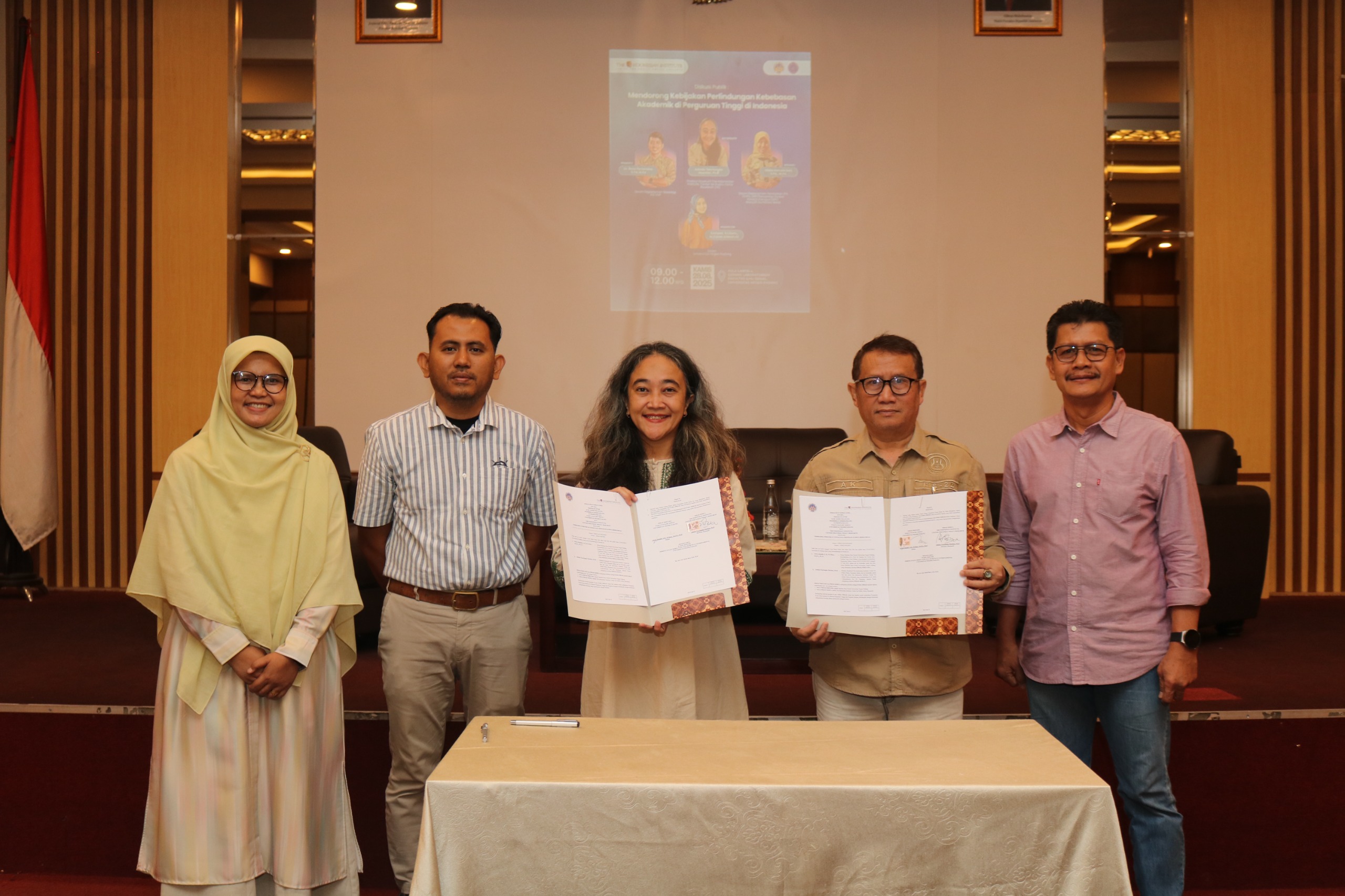 Kebebasan akademik sebagai bagian dari hak asasi manusia dan kebebasan berekspresi dijamin oleh konstitusi dan regulasi Indonesia, seperti UUD 1945, UU Sistem Pendidikan Nasional, dan UU Pendidikan Tinggi. Namun, dalam praktiknya, kebebasan ini masih menghadapi ancaman serius. “Pola pelanggaran akademik paling besar adalah pada kebebasan ekspresi akademik dan budaya yang mendominasi hingga 52 kasus terkait pelaku dan korban,” Jelas Adinda Tenriangke Muchtar dalam pemaparannya.