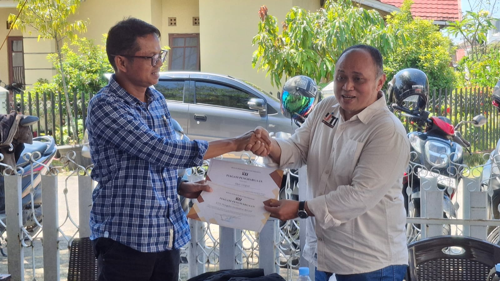 Ketua IJTI pusar Herik Kurniawan serahkan Piagam kepada Ketua IJTI Sumbar Defri Mulyadi disela diskusi Kebencanaan dan penyaluran Bantuan Korbam Bancana Sumbar di Sekretarian IJTI Sumbar