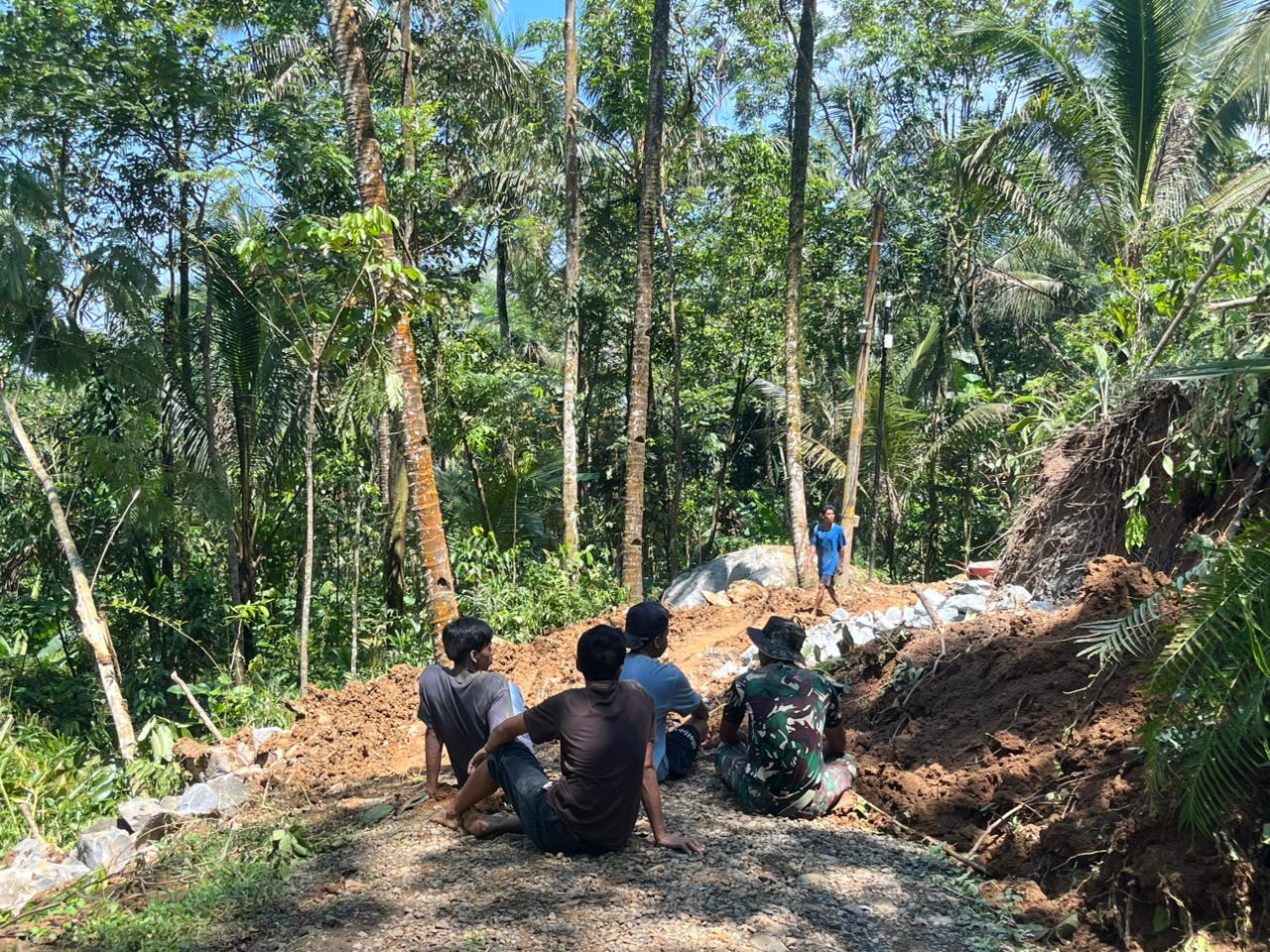 Sewaktu istirahat tiba, suasana perlahan berubah. Di bawah rindangnya pepohonan di tepi jalan desa, beberapa anggota TNI dan warga tampak duduk bersama. Seluruh peralatan kerja diletakkan sejenak, digantikan dengan obrolan ringan yang terus mengalir tanpa sekat. Canda tawa pun sesekali pecah, seolah menjadi penawar lelah setelah berjibaku dengan panas dan debu.