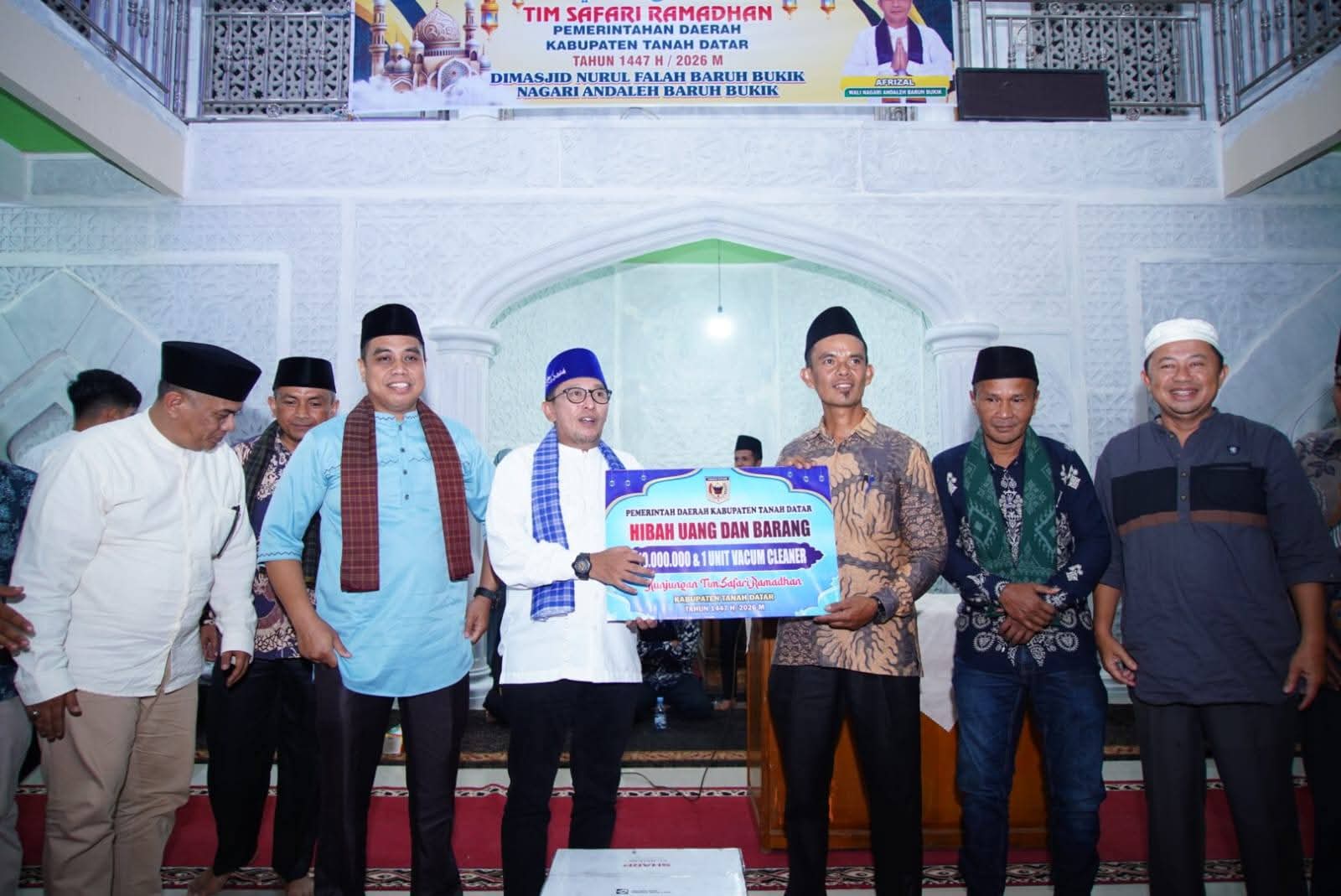 Dalam kesempatan itu, Bupati Eka Putra menyerahkan hibah masjid Rp10 juta, bantuan berbuka Rp2 juta, satu unit vacuum cleaner, serta dukungan Rp3 juta dari Bank Nagari Cabang Batusangkar.