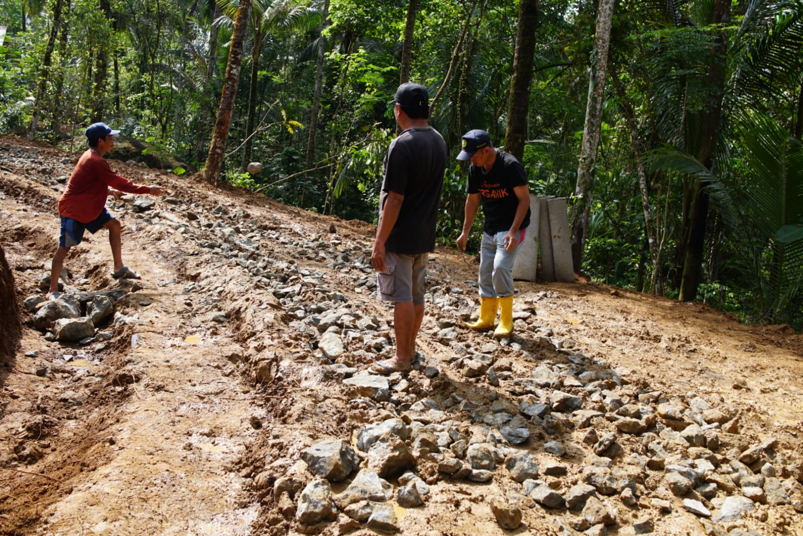 Kondisi tersebut membuat kendaraan pengangkut material khususnya mobil pickup kesulitan melintas, bahkan berpotensi tergelincir. Menyikapi hal itu, Satgas TMMD bersama warga segera mengambil langkah darurat dengan menaburkan batu di sepanjang jalur yang terdampak guna memperkuat struktur tanah.