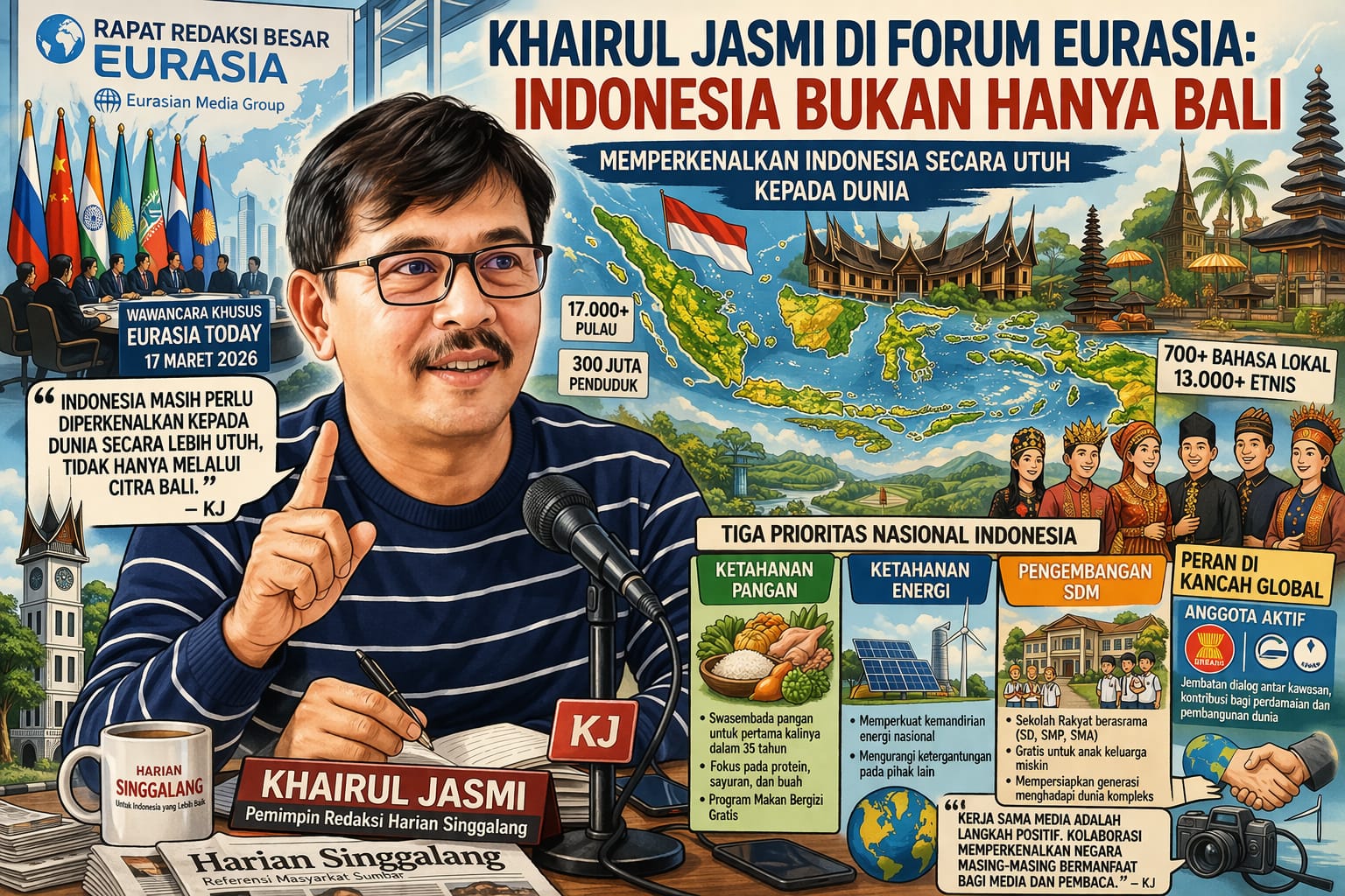 Padang, relasipublik — Pemimpin Redaksi Harian Singgalang, Khairul Jasmi, menegaskan bahwa Indonesia perlu diperkenalkan kepada dunia secara lebih utuh dan tidak hanya dikenal melalui citra Bali. Pandangan itu disampaikannya dalam wawancara khusus proyek internasional “Rapat Redaksi Besar Eurasia” yang digelar Eurasian Media Group dan dipublikasikan oleh Eurasia Today pada 17 Maret 2026.