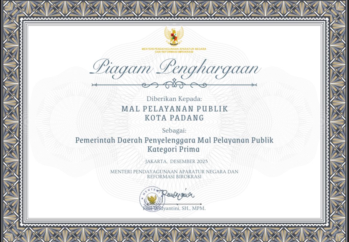 Selain Kota Padang hanya dua kota lainnya di Indonesia yang mendapatkan predikat Prima dalam evaluasi penyelenggaraan MPP Tahun 2025, yaitu Kota Banjarmasin dan Kota Tegal.
