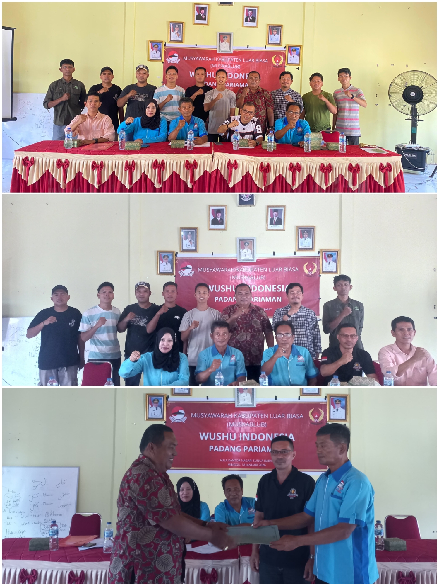 PANDANGPARIAMAN,RELASIPUBLIK–Musyawah Kabupaten Luar Biasa (Muskablub) Wushu Indonesia (WI) Kabupaten Padang Pariaman berjalan sukses, dengan aklamasi yang dihadiri Ketua KONI Padang Pariaman dan utusan Dinas Pariwisata dan Olahraga Padang Pariaman, mengambil lokasi di aula kantor Wali Nagari Sunur Barat.