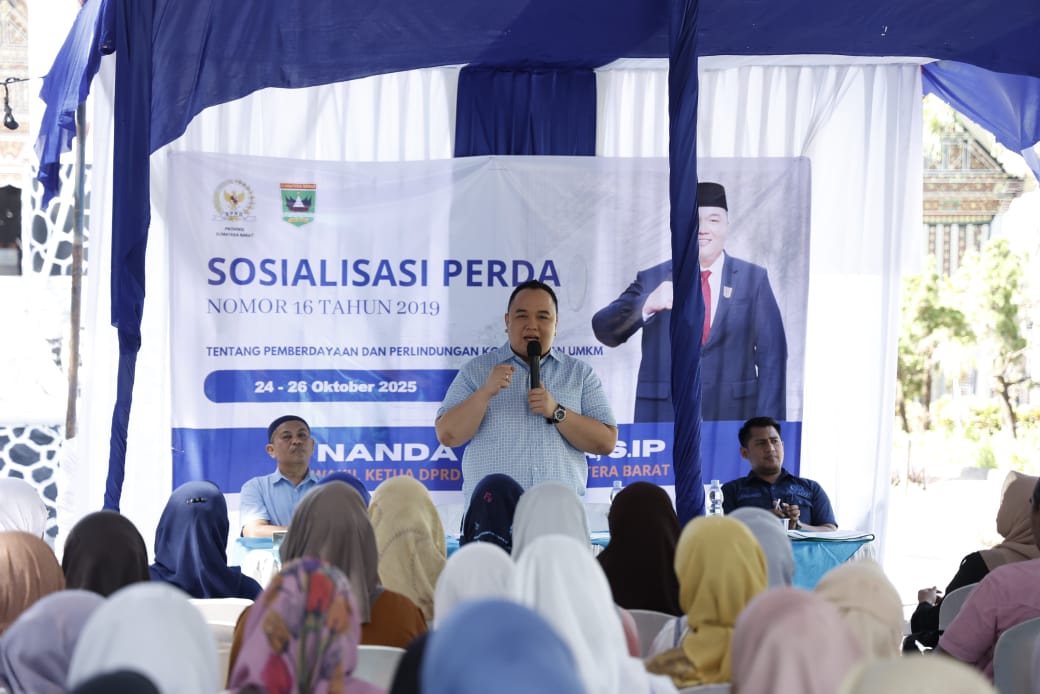 Padang,relasipublik – Sosialisasikan Perda Nomor 16 Tahun 2019 tentang Pemberdayaan dan Perlindungan Koperasi dan Usaha Kecil, Wakil Ketua DPRD Sumbar Nanda Satria ajak masyarakat yang jadi peserta sosialisasi ikut berperan menyebarkanluaskan aturan tentang perlindungan koperasi dan usaha kecil yang telah dimiliki Pemerintah Provinsi Sumbar.