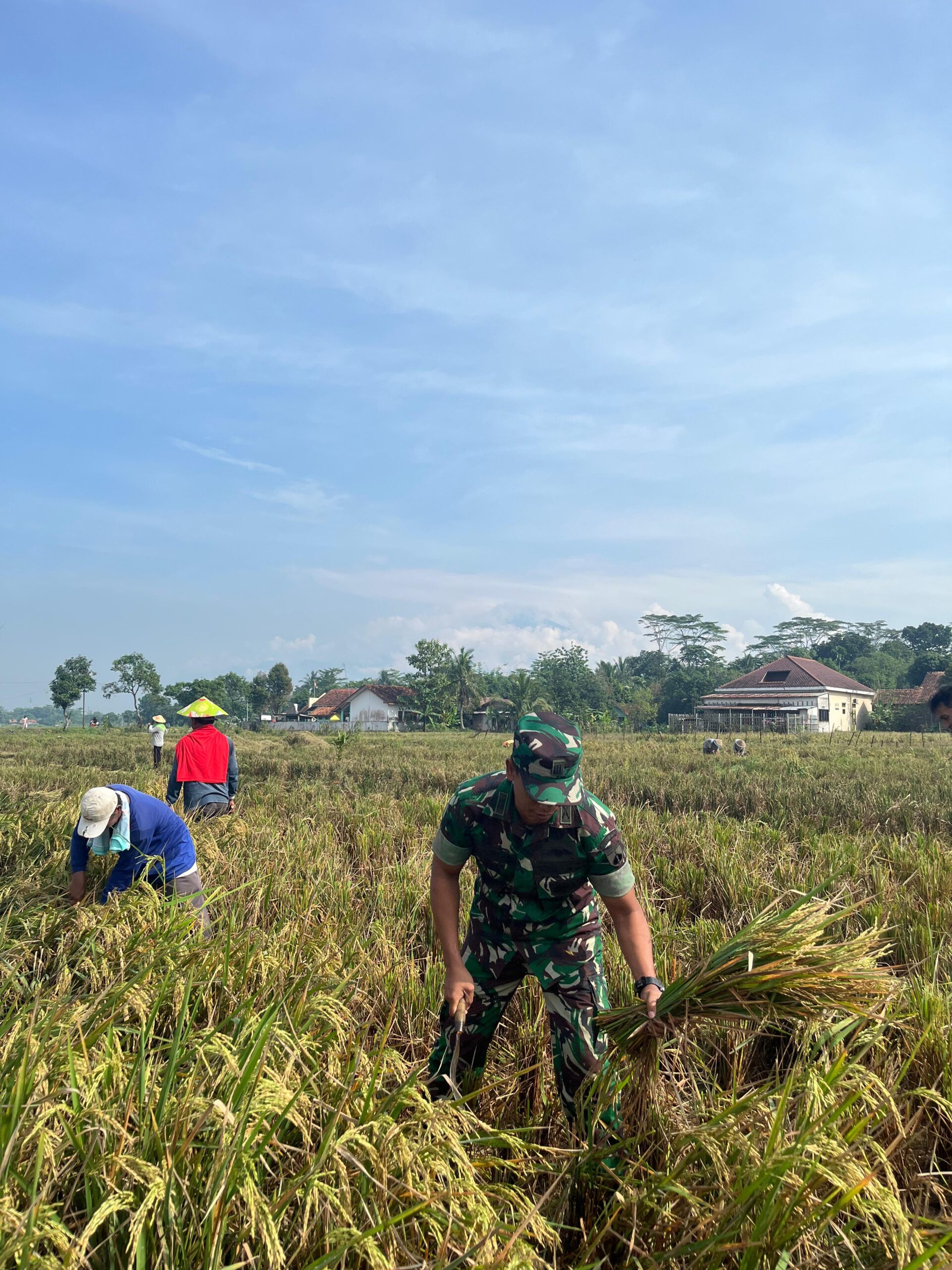 Tidak ada sekat antara seragam loreng ataupun pakaian petani, keduanya menyatu dalam satu irama untuk memanen bulir demi bulir padi yang telah menguning.