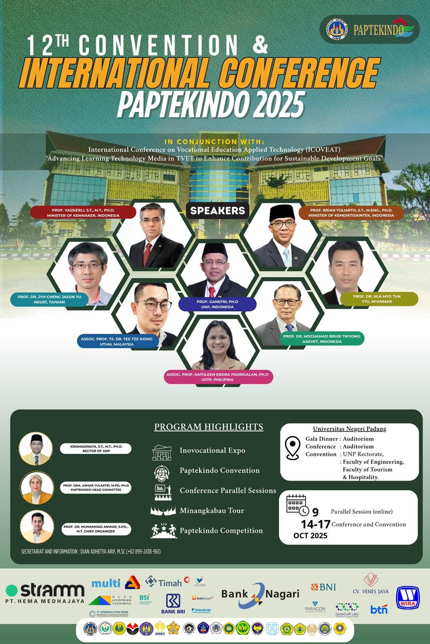 Padang,relasipublik – Perkumpulan Ahli Pendidikan Teknologi dan Kejuruan Indonesia (PAPTEKINDO) siap menggelar Konvensi ke 12 dan Konferensi Internasional di Universitas Negeri Padang (UNP) pada 9 dan 14–17 Oktober 2025. Kegiatan bertaraf internasional ini akan mempertemukan akademisi,