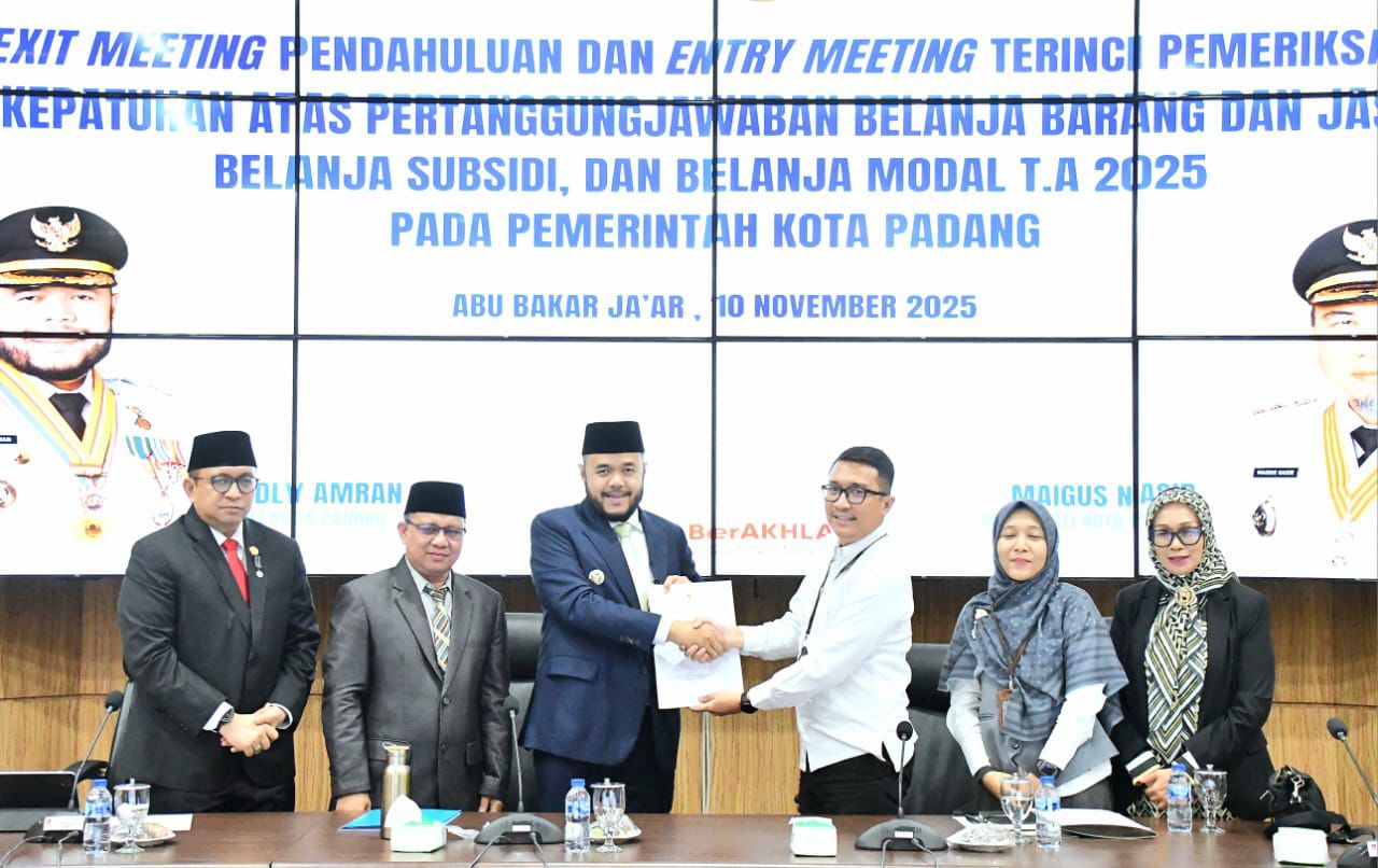 Padang,relasipublik – Pemerintah Kota (Pemko) Padang bersama Badan Pemeriksa Keuangan Republik Indonesia (BPK RI) Perwakilan Provinsi Sumatera Barat (Sumbar), menggelar Exit Meeting Pendahuluan dan Entry Meeting Pemeriksaan Terinci Kepatuhan atas Pertanggungjawaban Belanja Barang dan Jasa, Belanja Subsidi, serta Belanja Modal Tahun Anggaran 2025.