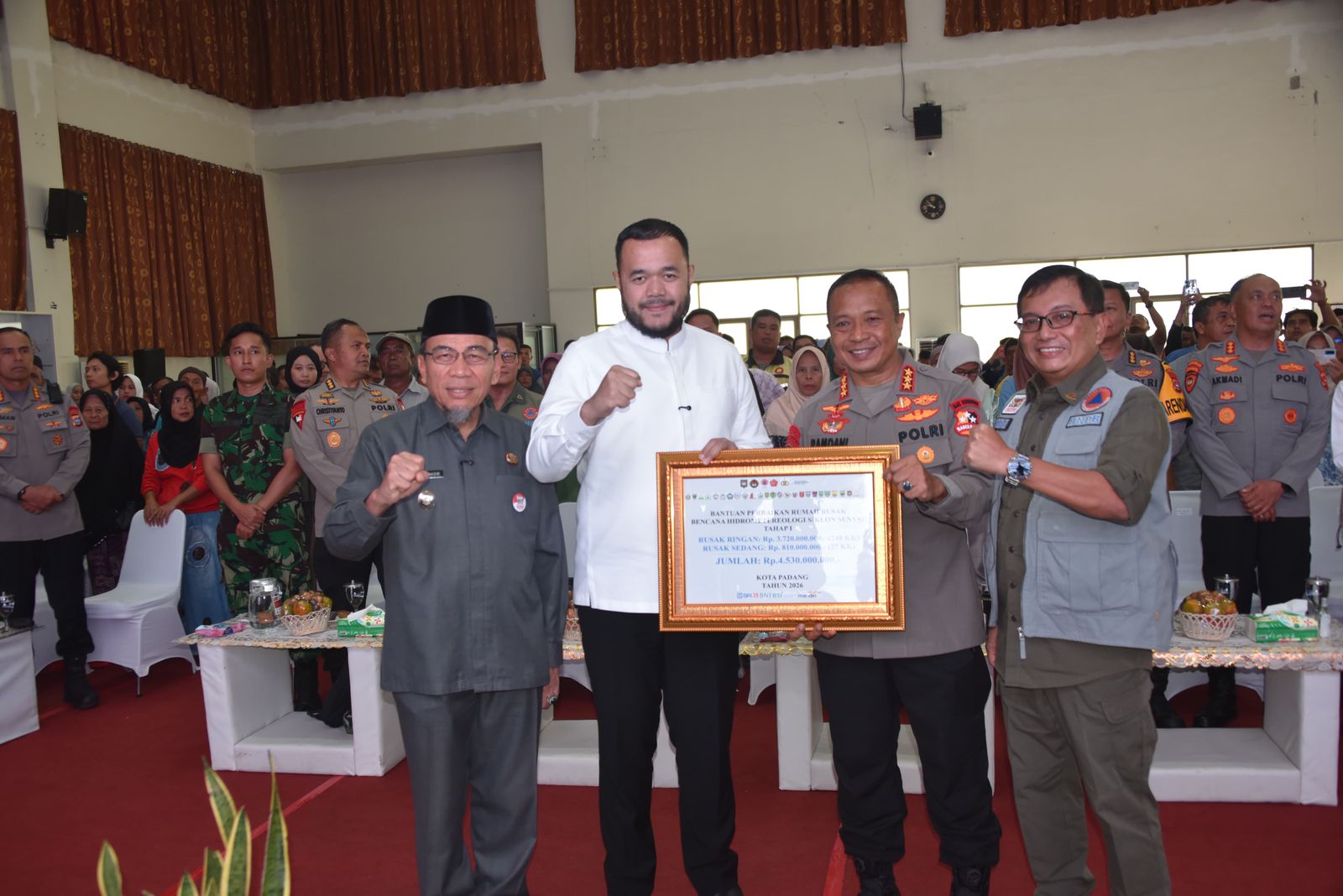 Untuk Kota Padang, total dana bantuan yang diserahkan senilai Rp. 4.530.000.000, terdiri dari bantuan rumah Rusak Ringan sebesar Rp. 3.720.000.000 untuk 248 KK, serta bantuan rumah Rusak Sedang sebesar Rp. 810.000.000 untuk 27 KK. Masing-masing penerima memperoleh Rp. 15.000.000 untuk kategori Rusak Ringan dan Rp. 30.000.000 untuk Rusak Sedang.