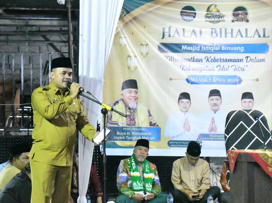 Padang, relasipublik – Mewakili Wali Kota Padang, Penjabat (Pj) Sekretaris Daerah Kota Padang, Raju Minropa, menghadiri acara Halal Bihalal 1447 Hijriah yang digelar di pelataran Masjid Istiqlal Binuang, Kelurahan Binuang Kampung Dalam, Kecamatan Pauh, Selasa (7/4/2026) malam.
