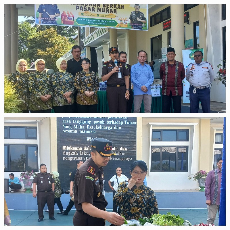 Kejaksaan Negeri Tanah Datar menggelar kegiatan “Ramadhan Berkah Pasar Murah” dengan tema Minang Bangkit Bersama UMKM Mitra Adhyaksa di halaman Kantor Kejaksaan Negeri Tanah Datar, Kamis (12/3). Kegiatan yang dilaksanakan serentak se-Indonesia sesuai Instruksi Kepala Kejagung RI menjadi wujud kepedulian institusi penegak hukum tersebut dalam membantu masyarakat memperoleh kebutuhan pokok dengan harga terjangkau selama bulan suci Ramadan.