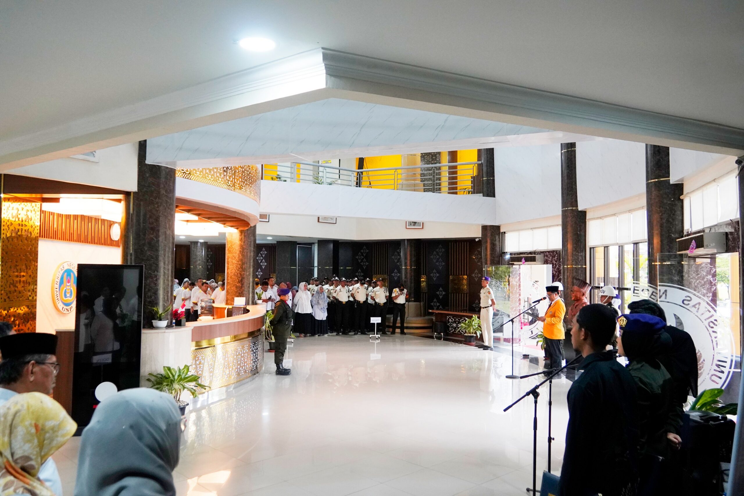 Padang,relasipublik – Meski hujan mengguyur Kota Padang sejak pagi, semangat nasionalisme sivitas akademika Universitas Negeri Padang (UNP) tak surut dalam memperingati Hari Pahlawan Nasional Tahun 2025. Upacara peringatan berlangsung khidmat di Lobi Rektorat UNP pada Senin (10/11/2025), dipimpin langsung oleh Wakil Rektor Bidang Akademik, Kemahasiswaan, dan Alumni, Prof. Dr. Refnaldi, S.Pd., M.Litt.