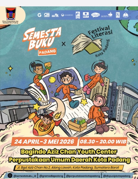 Diselenggarakan pada 24 April – 3 Mei 2026 di Gedung Bagindo Aziz Chan Youth Center dan Perpustakaan Kota Padang, kegiatan ini menjadi ruang terbuka bagi masyarakat untuk mengakses buku, merayakan literasi, serta terlibat dalam berbagai aktivitas edukatif dan inspiratif.
