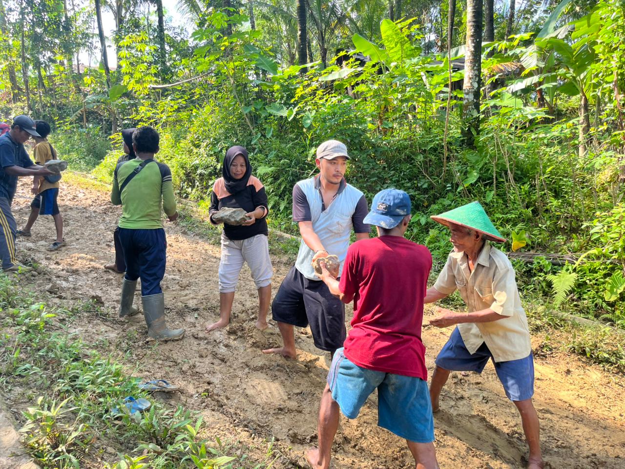 Di lokasi pekerjaan, para warga tampak berbaris memanjang, saling mengoper batu dalam estafet menuju titik pondasi jembatan. Satu per satu, batu berpindah dari tangan ke tangan, membentuk alur kerja yang rapi dan terus mengalir.